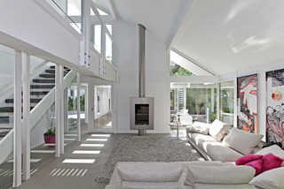 Ein überhang aus der oberen etage des hauses spendet schatten während das oberlicht das natürliche licht einfängt. Wohnzimmer mit kamin modern kollektion. Versuchen sie auf nicht benötigte möbel zu verzichten und streben sie freie flächen an.