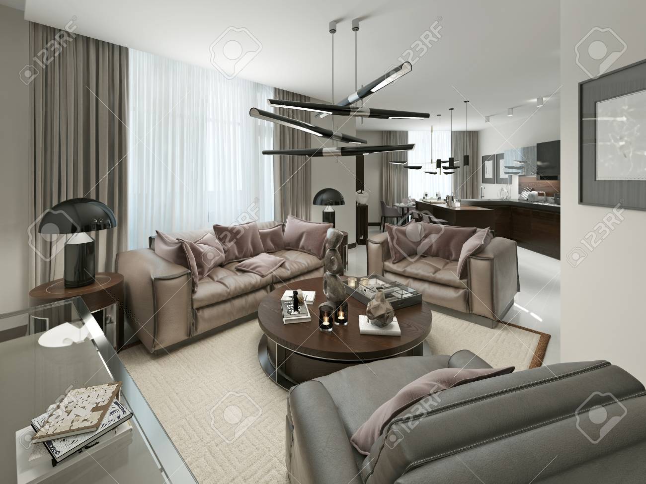 Vor dem kamin im hinteren teil des wohnzimmers gruppieren sich sofa sessel und couchtisch die von einer stehlampe mit weißem schirm beleuchtet werden. Modernes wohnzimmer mit essbereich rendering lizenzfreies bild von modernes wohnzimmer mit essbereich photo. 0 0 5 1.