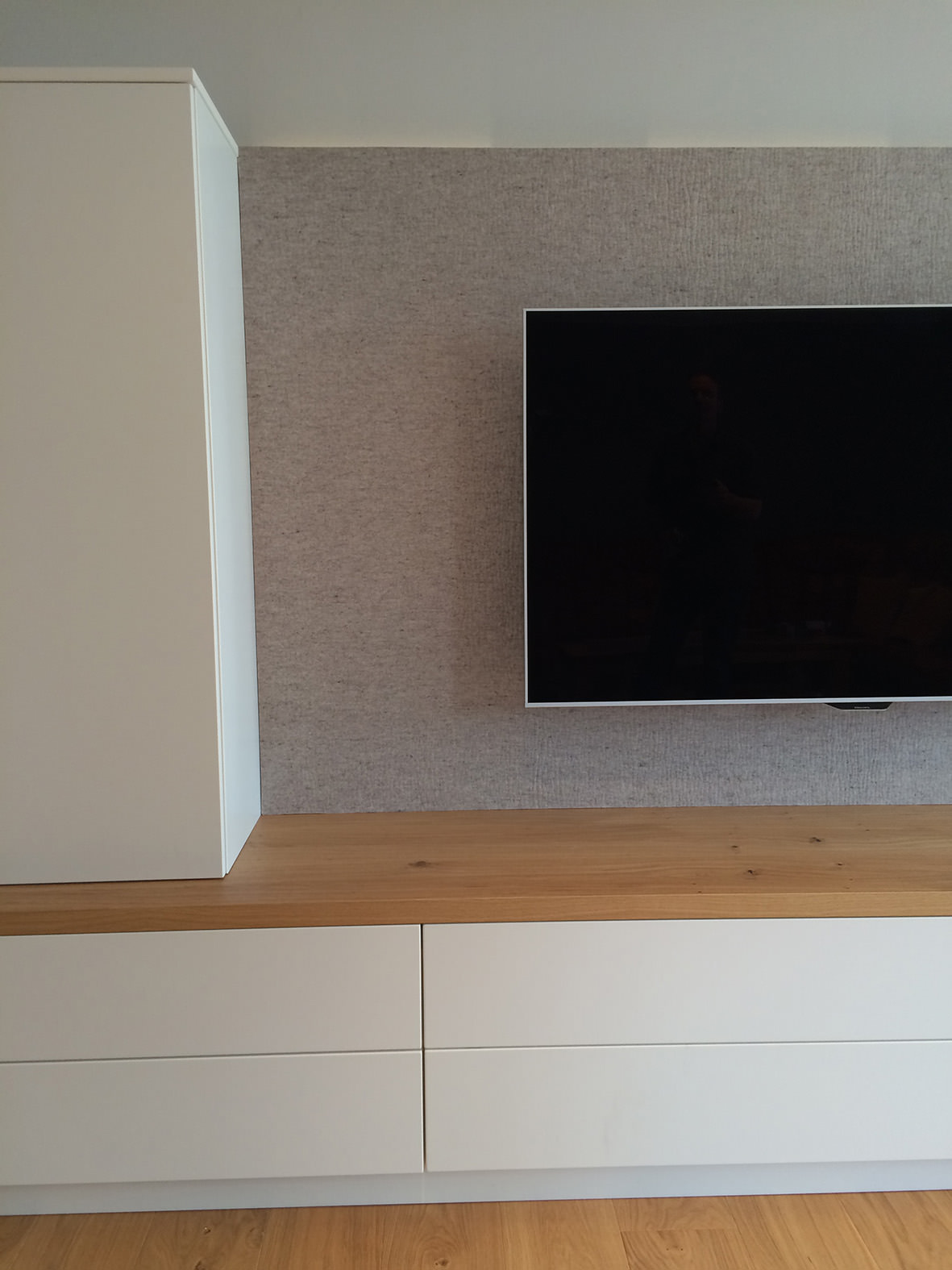 So habe ich eine tv wand b 190 x h 195 x t 13 mit led hintergrundbeleuchtung gebaut. Eine wand mit hohlraum oder massiv verlängern. Durch weiße oberflächen und eine massive holzplatte aus eiche wirkt das wohnzimmer freundlich und hell.