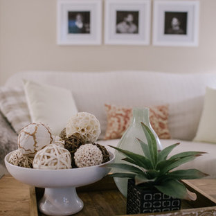 Couchtisch aus altem fass. Kleines landhausstil wohnzimmer mit weißer wandfarbe und teppichboden in cornwall. Landhausstil im wohnzimmer bilder regale und kleinigkeiten.