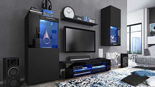 Wohnwand media light anbauwand schrankwand in schwarz mit beleuchtung wohnzimmer. Bringen sie neue frische in ihr zuhause mit diesem tollen wohnzimmerprogramm. Wohnwand light moderne anbauwand in angesagtem design in der farbe schwarz mit glasfront inkl. 2 vitrinen mit jeweils 1 glastür.